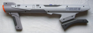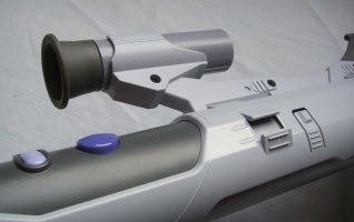 ![]() Der Infrarotsensor besitzt einen normalen Controller Stecker. Beim Super Scope handelt es sich mehr um eine Panzerfaust, als um eine Lightgun im konventionellen Sinn. Man legt sie sich nämlich auf die Schulter und der eigentliche "Abzug" besteht aus einem roten Knopf oberhalb des Rohres. Daneben befindet sich noch der On/Off/Turbo und der Start/Pause Button. 6 AA Batterien schluckt das Monster (ist allerdings schlanker als die Menacer, was man am bloßen Foto nicht erkennt) in 4 Stunden, um per Infrarot, Signale zu empfangen. Der Sensor wird dafür idealer Weise auf den Fernseher gestellt. Zudem darf seitlich des Super Scopes eine kleine Zielhilfe in Form eines Fernrohrs angebracht werden (auf beiden Seiten befindet sich eine Vorrichtung). Warum Hassliebe? Nun, die Enttäuschung war groß und hielt bis heute an. Präzises Zielen war durch die damals neue Technik zwar nun endlich gegeben, nur machte das Handling der Super Scope diese dem Erdboden gleich. Deshalb wollte auch kein wirklicher Spaß aufkommen. ![]() Das 'Zielfernrohr' kann sowohl an der linken als auch an der rechten Seite angebracht werden. Nur für Sammler interessant, die einfach mal wissen wollen, wie es ist und sich damals nie den Wunschtraum erfüllen konnten. Mitgeliefert wird übrigens noch eine 6 in 1 Cartridge (separater Test). Ich würde mir den Scope nicht noch einmal kaufen! Es sei denn, man kann sich die Top Titel sichern.