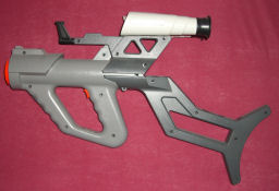 Die Menacer besteht aus drei Teilen und kann in vier Variationen genutzt werden: Zu aller erst hätten wir da das "Master Modul", welches die eigentliche Lightgun darstellt. Hier haben 6 AAA Batterien Platz, denn die Menacer wird ebenso wie das Super Scope per Infrarot-Sensor erfasst. Leider kann sie aber nicht aus-/abgeschaltet werden, so dass die Batterien nach dem Spielen stets entnommen werden sollten. Vier Buttons stehen außerdem zur Verfügung: Der Abzug (eigentlich nur ein Druckknopf, der zudem leider sehr weich ist) und drei an der Vorderseite platzierte Knöpfe für eventuelle Zusatzoptionen. Ähnlich, wie bei der PX098 kann ein "Stabilisierungs-Modul" (Kolben) angebracht werden, so wie ein Binokular-Modul (welches aus drei Teilen besteht), was ein einfaches Fernrohr darstellt. Bis auf das letzte Modul ist auch alles sehr nützlich. Die Lightgun ist exzellent verarbeitet, allerdings schon ohne Batterien etwas schwer. Obwohl es im Vergleich zur Super Scope, nicht so viele Spiele gibt, gefällt die Menacer jedem Lightgun-Fan auf Anhieb. Sie ist einfach viel besser zu bedienen, strotzt mit Features und ist auch noch leicht präziser als die Panzerfaust von Bandai/Nintendo. Letztendlich triumphiert sie noch mit idealer Handlichkeit! Leider kann man, wie gesagt, nur wenige Spiele wirklich empfehlen. Mit der 6 Game Cartridge und T2: The Arcade Game ist man bestens bedient. Ansonsten darf man noch bei Corpse Killer und besonders Body Count zugreifen, wenn man diese Spiele überhaupt erhascht. Mehr gibt es ohnehin nicht. ;) Eines meiner liebsten Sammlerstücke! Zusatz: Beim Kauf ist Vorsicht geboten! Leider haben die Menacer eine Krankheit, die sich erst nach einiger Zeit bemerkbar macht. Dabei kommt es vor, dass der Zielpunkt am Bildschirm ein Eigenleben entwickelt. Ich habe das bereits bei mehreren meiner Menacer feststellen müssen. Am besten ihr könnt sie vor dem Kauf testen.