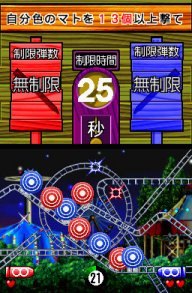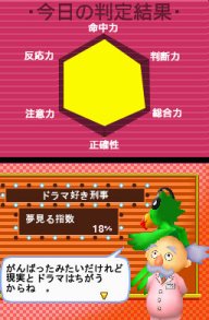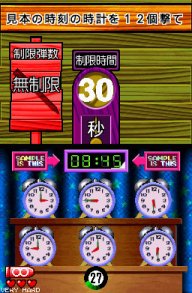 Seltsame Wege beschreitet Namcos (mit Bandai zusammen) neuster Ableger der Point Blank Serie nämlich. Der Mix aus den drei Vorgängern für die PlayStation birgt über diese Tatsache hinaus nicht nur mehr Spielmodi und einen tollen Multiplayermodus, sondern wird als erster Lightgun-Shooter nicht mit einer Lightgun gespielt. Jedem dürfte einleuchten, dass die Verwendung einer Lightgun am Nintendo DS umständlich und durch die kleinen Bildschirme unmöglich wäre. ![]() Ist es wirklich schon so spät..? Auch das Uhrenspiel ist wieder mit dabei. Die Minispielsammlung schreit offensichtlich eher nach einem Vergleich zu Titeln wie Wario Ware Touched, Rub Rabbits oder die Zusätze bei Mario 64 DS bzw. dem neuen New Super Mario Bros., da ein Vergleich mit Lightguntiteln nicht angebracht ist. Zum Glück schafft es Unou no Tatsujin: Gunbullet Trainer (so der japanische Originaltitel) jedoch ein noch mal ganz eigenes Genre im Genre zu etablieren und muss sich eigentlich nicht mit dieser Konkurrenz messen. Wobei - wenn man ehrlich ist - die Konkurrenz wäre auch ein klein wenig überlegen. Denn die "Klopperei" mit dem Stylus auf dem Bildschirm ist zwar recht amüsant, doch legt man nach wenigen Minuten doch lieber die PlayStation Version ein und daddelt mit GCon45, um festzustellen, dass es so mehr macht. Allerdings: Unou no Tatsujin: Gunbullet Trainer ist riesig an Umfang und noch mal ein ganz anderes Point Blank, als wir es bisher kennen. Zwar geben sich Dr.Dan und Dr.Don die Ehre, hauptsächlich führt einen jedoch ein Professor mit grünem Papagei durch die Menüs. ![]() Am Schluss einer Session werden euch eure Ergebnisse präsentiert. Grafisch ist nicht viel anzumerken, außer dass es ausreichend ist und ebenfalls an die Vorgänger anknüpft. Der Sound ist wieder mal gewöhnungsbedürftig, dafür aber passend! Kommen wir kurz noch auf den genialen Multiplayer! Es kann aus 5 Zusammenstellungen, mit jeweils 4 Minispielen (weiß nicht, ob es noch mehr geben wird) gewählt werden, um gegen einen Freund simultan mit nur einer Cartridge zu zocken. Diese Möglichkeit macht den eigentlichen Spaß am Spiel aus und sollte meiner Meinung nach der hauptsächliche Kaufgrund sein. Ich selbst habe den gesamten Sonntag Nachmittag mit einem Freund zusammen nur die bekannten Minispielchen verschlungen und wir waren uns danach einig, dass selbst ein New Super Mario Bros. keinen besseren Multiplayer hat - Metroid Prime Hunters und Advance Wars DS lassen wir dabei mal außer Acht. ![]() Déjà vu? Kenner der PSX-Version dürften sich heimisch fühlen. Dieses Preview wurde 24 Stunden nach dem Erhalt der japanischen Original-Version geschrieben. Für etwaige Nichtnennungen, verweise ich darauf, dass ich kein japanisch lesen kann und deshalb einige Menüs nicht vollständig erforschen konnte. So soll die Cartridge noch einen sog. "Right Brain Master" (Spielserie von Namco) Inhalt besitzen. Zwar kann ich eine gewisse Statistik (siehe Screenshot 2) abrufen, die ich aber eben nicht lesen kann. Vermutlich wird dort Reaktion, Zielgenauigkeit, usw. angegeben. Zusatz vom 29.06.2006: Die US-Version ist eingetroffen! Ich fasse mal in kurzen Sätzen zusammen was wir nun alles besser einsehen können: Das Menü besteht aus: Versus, Arcade, Freeplay, Options, Brain Massage und Games Museum. Im Einzelnen handelt es sich dabei: