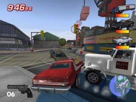 ![]() Hier habt ihr es gleich mit drei Fahrzeugen zu tun, schießt sie schrottreif!! Schließt an Port 1 einen Controller und in USB 1 eine G-Con2/45 oder irgendeine Waffe, die den nötigen Modi unterstützt. Nachdem ihr in den Optionen des Spiels nun Spieler 2 die G-Con2/45 zugewiesen und kalibriert habt, kann es losgehen. Das Spielprinzip ist ebenfalls derartig einfach: Spieler 1 fährt den heißen Ofen und Spieler 2 ballert aus vollen Rohren ohne nachladen zu müssen. Dabei geht es immer durch ganz Bay City (dem Einsatzort von Starsky & Hutch) hinter irgendeinem Fahrzeug her, welches möglichst heftig gerammt und besonders heftig beschossen werden sollte. Sobald die Energieleiste des Fahrzeugs zu Ende geht, habt ihr gewonnen. Zudem können Extras, wie Turbo oder Blaulicht, eingesammelt werden. Dabei ist genaues zielen nicht unbedingt erforderlich, da die zu treffenden Objekte sehr groß sind. Allerdings sollten möglichst viele davon eingesammelt werden und das gegnerische Fahrzeug nie zu weit entfernt von einem sein, da sonst eure Einschaltquote am oberen linken Bildschirmrand gegen Null geht, was den Einsatz zum scheitern verurteilt. Die Umgebung kann völlig zerfahren werden und es stehen euch oftmals auch Sprungmöglichkeiten zur Verfügung. Die Steuerung des Fahrzeugs ist dabei passend arcadig. Das Spiel kann nur im Zweispieler-Modus genossen werden und unsere Wertung bezieht sich auch ausschließlich darauf. Der Sound ist cool und passend und der Multiplayer macht eben einfach nur Fun, mehr aber auch nicht! Erwartet keine Herausforderung, Abwechslung oder ähnliches. Kommen wir aber zu einem sehr heftigen Problem: Die Kalibrierung ist unter aller Sau! Leider kann das Fadenkreuz nicht optimal ausgerichtet werden und manchmal verstellt es sich auch von allein, so dass eigentlich neu kalibriert werden müsste. Etwas ärgerlich, da aber genaues zielen nie abverlangt wird und eben der Spaß im Vordergrund steht, nicht weiter störend. Da das Spiel sehr billig ist, eignet sich eine Anschaffung für gute Zockerkollegen allemal! Nachdem ich so viel Spaß bei Mortal Kombat Shaolin Monks mit einem sehr guten Freund hatte, nahmen wir uns auch Starsky & Hutch zur Brust und hatten abermals eine Menge Spaß! Wirklich tolle Idee, trotzdem ist es weder ein anständiger Lightgun-Shooter, noch ein potentieller Hit. Als Bundle gabs das Spiel kurze Zeit mit Lenkrad und Lightgun von Thrustmaster. ![]()